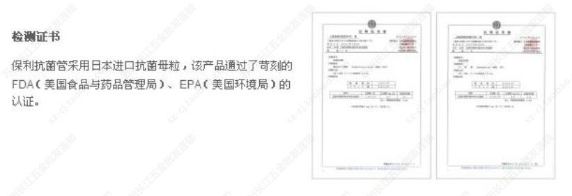 2.上海保利PP-R采用日本進(jìn)口******母粒,并通過了苛刻的FDA(美國(guó)食品與藥品管理局)、EPA(美國(guó)環(huán)境局)的認(rèn)證