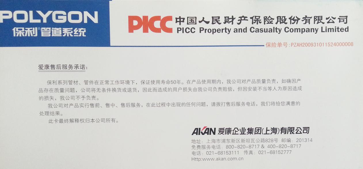4.上海保利PP-R的廠家在PICC(中國(guó)人民財(cái)產(chǎn)保險(xiǎn)股份有限公司)投保確保使用壽命長(zhǎng)達(dá)50年。